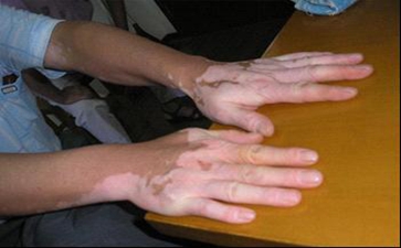 4、摩擦或拍打实验。用手摩擦或拍打白斑及其周围正常皮肤,当周围皮肤变红时,观察白斑处是否有变化,如果周围皮肤发红而白斑处更白,则提示为平血痣,白癜风白斑在皮肤摩擦或拍打后和周围皮肤一样会发红。